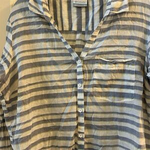 Keywords: Columbia, button-up, women's shirt, XL, blue, striped, casual, spring, collared, long sleeve, cotton, polyester, machine washable.