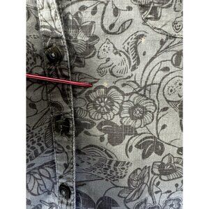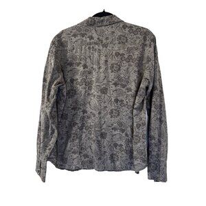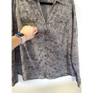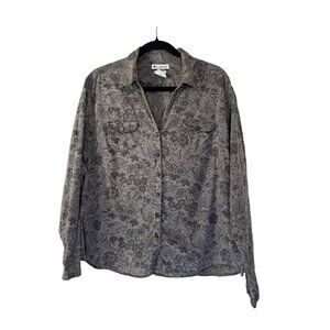 Columbia Womens XL Brown Floral Linen Button Down Top Outdoors Preppy Country Bl. This is a beautiful women's long-sleeve button-down shirt from Columbia, size XL. The shirt features a lovely brown floral and Gray background. Made from a breathable blend of cotton, it is perfect for warm weather or layering. Design features include a full button-front closure, a classic collar, and long sleeves. This versatile piece blends an outdoorsy feel with preppy and country casual styling. Approximate measurements are 23 inches from pit to pit and 26 inches in length. Made in India. Nice pre loved condition. Staining on front and sleeve see pictures.
