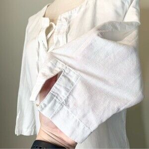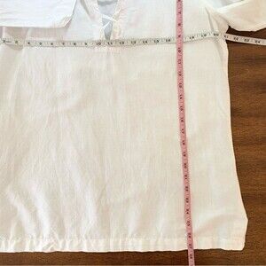 Columbia X.C.O. Tie Front Linen Blend Tunic Top, color is white, two wooden beads at end of front ties, split hem at arms hems and bottom hem, Linen and Cotton blend