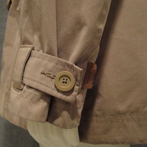 Great condition, one spot on sleeve. Lining is flawless! This would make a great travel jacket for that in-between weather. Zip and button front, collar turns up and buttons, cuffs have 2 buttons to cinch. Many exterior and interior pockets. Soft exterior 60% polyester 20% cotton 20% nylon, lining 100% polyester.