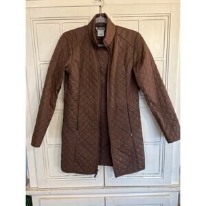 Columbia XCO size small women’s brown coat with a detachable lining. 2 jackets in one. Buttons and zips. Inner jacket just zips. Measures 19” from armpit to armpit and 33” long.