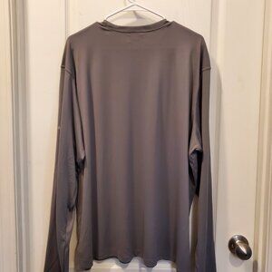 About this item: Long Sleeve Performance/Fishing Shirt. Appears to be an Omni-Shade or similar quick-dry, sun-protection style | Perfect for fishing, hiking, boating, or casual wear, this shirt features a classic dark grey color with a unique, eye-catching distressed American Flag graphic on the chest.