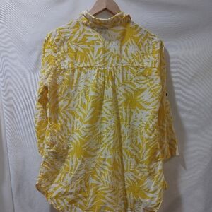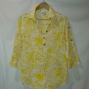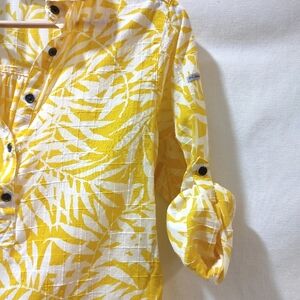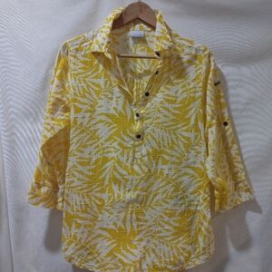 Columbia Yellow White Fern Leaf Pattern Popover Shirt Roll Tab Sleeve Medium M