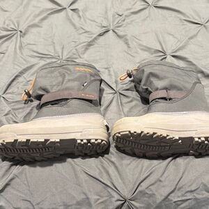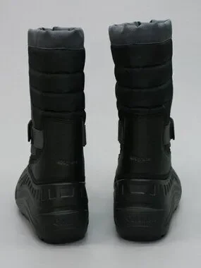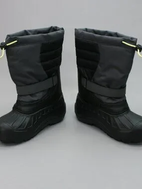 A pair of big kid's youth Columbia black hook and loop strap bungee cord 400 gram insulate snow boots.