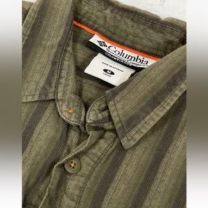 The shirt features a spread collar neckline and button accents with the Columbia logo on the chest. It is a basic green color with a striped pattern that is perfect for an outdoor theme. The shirt is easy to care for with a medium fabric wash. This is a great addition to your child's collection for sure.