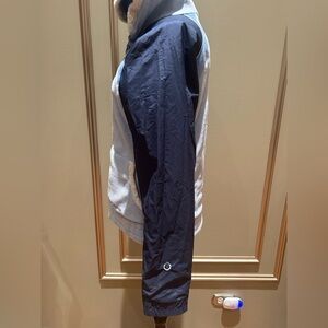 • Color: Light gray and navy blue with soft cream sherpa hood trim