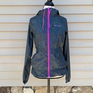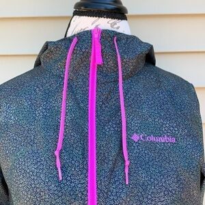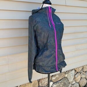 Navy with sage and tan dotted floral print, with a contrasting magenta zipper and hood strings. Purple silk screened logo on chest, the logo has some wear and the zipper pull paint is worn in areas but other than that the jacket is in excellent condition. Please see pics.