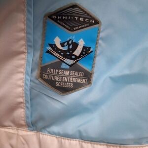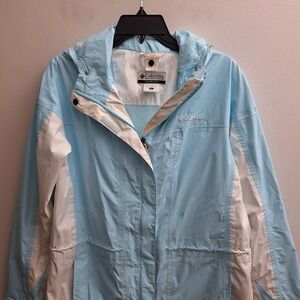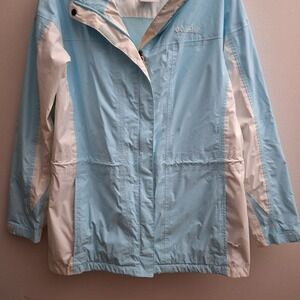 Columbia Zip Jacket Women Large Blue White Soft Shell Lined Hood Nylon Omni-Tech