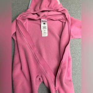 This item is a light pink, and features the ability to tuck the hands and feet in - or uncover them - without the hassle of mittens! See photos for examples of both. It also has the Columbia logo, a long zipper for easy dressing and diaper changes, and an adorable two tone hood with a gnome feel to it!