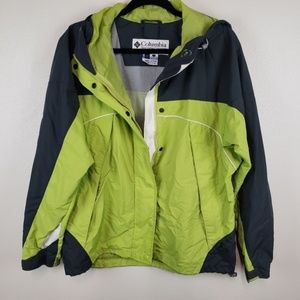 Columbia green and dark gray core jacket womens L. Hood attached, velcro sleeve tabs Excellent condition.