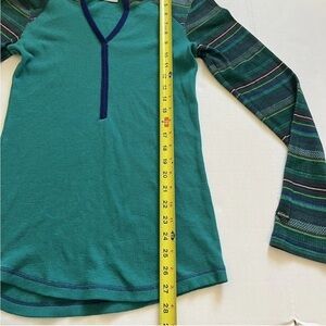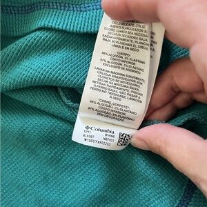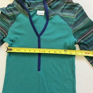 The middle is more of a green than blue. One small mark on lower front as seen in photo. Front doesn’t button or zip - it’s sewn shut up to the vneck.