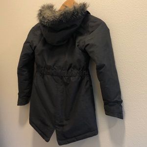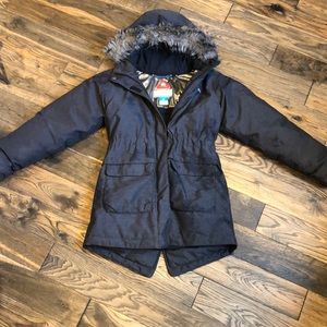 Kids Columbia jacket, tailored fit, girls Sz small (7/8), graphite in color. Omni heat insulation. Small hole shown in picture on the back of R sleeve.