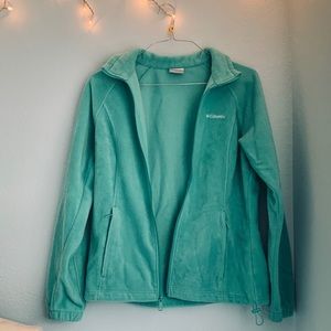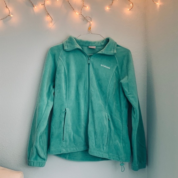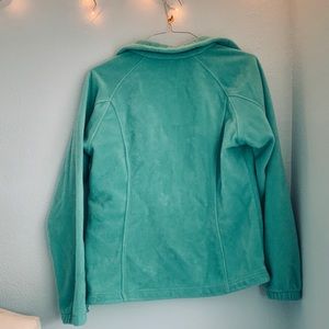 Worn a few times but basically looks new. Material is very soft and warm. Color is a bright colorful teal like a mix of blue/green. There’s a size adjuster at the bottom to tighten it and there’s inside and outside pockets.