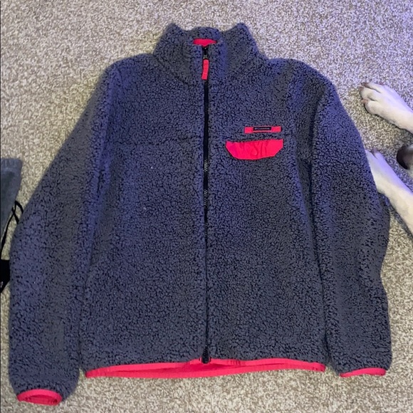 Hardly worn nice zip up jacket. Outside is grey with pink pockets and inside is pink