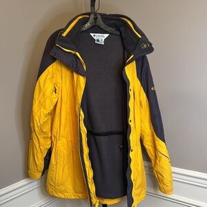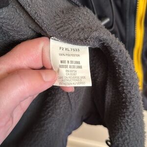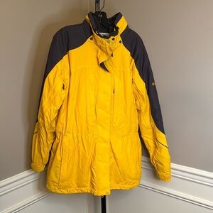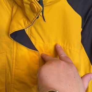 Two minor spots on the front as pictured. Is missing the hood that was detachable. Features yellow and gray throughout with a clinched waist. Cuffs and bottom are also adjustable. Includes the removable fleece on the inside. Size women's extra large. Approximately 33 inches. The sleeves are approximately 26 inches. From pit to pit is approximately 24 inches.