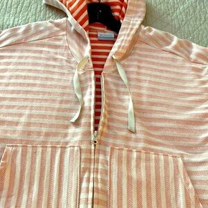 Columbia knit jacket, size L. This has a unique fabric choice- the lighter orange is outside and the vibrant orange is inside. Cute contrast, especially when worn open! Not terribly heavy so a good piece for cross seasonal use . Sporty and fun! 98% cotton