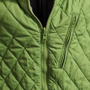 Columbia lime green diamond quilted jacket, VG used condition, size XL. Zipper closure, 2 front zippered pockets, & 1 zippered breast pocket, gray lining, adjustable at bottom hem. Shell, brushed lining & insulation are 100% polyester, lining is 100% nylon. A few minor stains on the back of the left sleeve (see photos) 19" shoulder to shoulder, 23" pit to pit, 25.5" length, 24.5" sleeve length. A lighter weight jacket.