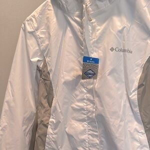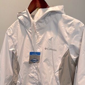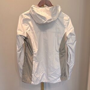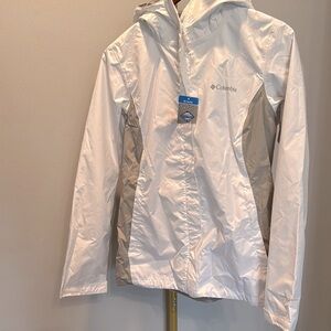 Columbia jacket with a sleek design. White and taupe color scheme. Hooded for extra coverage.