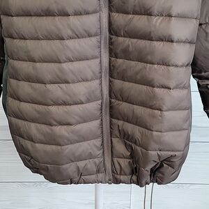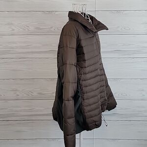 A versatile lightweight puffer jacket by Columbia in a two-tone color scheme, a loose comfortable fit, and a drawcord hem. Great pre-owned condition.