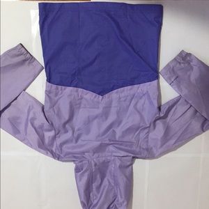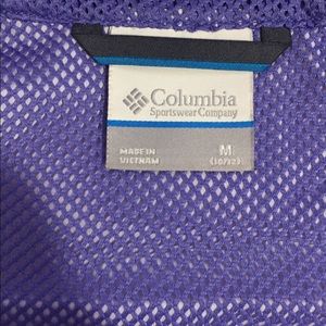 This is a Columbia rain jacket, it is a light purple on the top on the jacket and on the bottom of the jacket it is a darker purple. It has two pockets on each side, they do not have sippers. It is a very thin material but you can where a sweatshirt under if you would like.