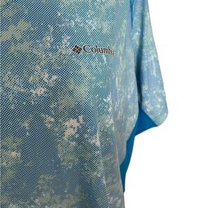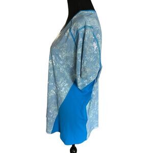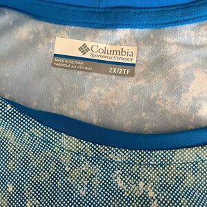 Columbia round neck patterned short sleeved top, size 2X. Blue, white.100% polyester. Approximate measurements are pit to pit flat 25.5”, length from shoulder approximately 27”. Solid blue inserts on sides.