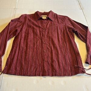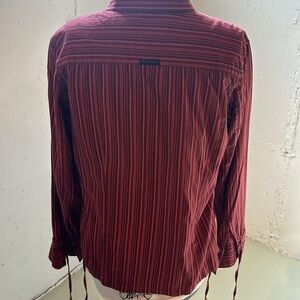 EUC lightweight shirt w sleeve tie backs maroon and darker pink orange stripes. Collar neck