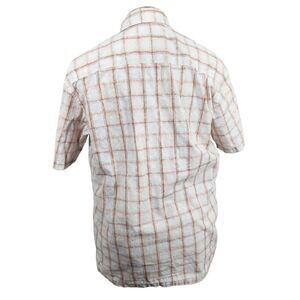 Columbia sportswear company short sleeve button front shirt in orange white plaid. Front pocket, 100%cotton