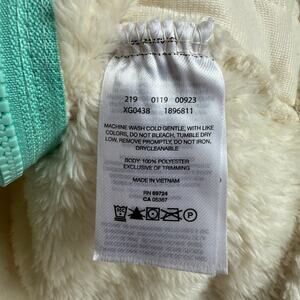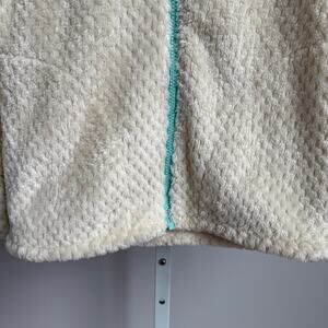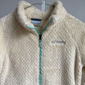 This is a pre-owned Columbia fleece jacket, size L (14/16). The jacket is cream-colored with a textured, plush exterior. It features a full-length turquoise zipper and a stand-up collar. The Columbia logo is embroidered on the left chest. The material is 100% polyester. There is a small stain on the front of the jacket. The jacket appears to be in good, functional condition.