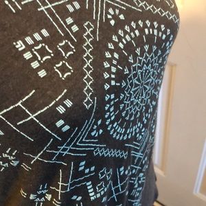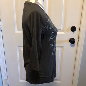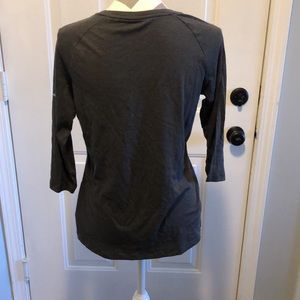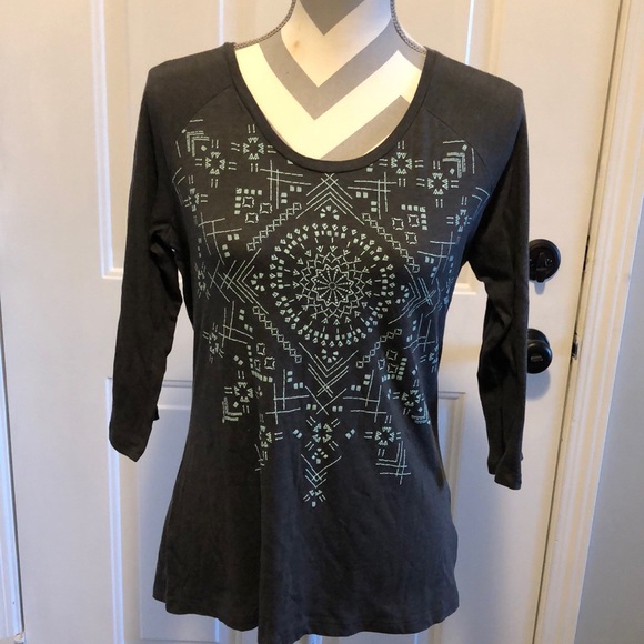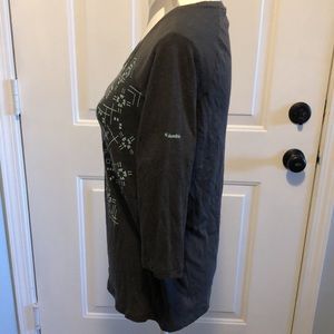 Columbia yup, 3/4 sleeves. Teal design on front. Logo on sleeve. Soft
