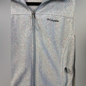 Columbia women’s herringbone pattern blue and white zip up fleece jacket. Size S