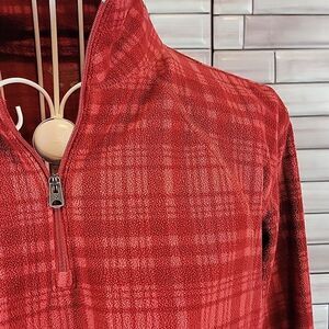 Columbia red tartan plaid pullover fleece top with 1/4 zip mock neck, long sleeves, and a straight hemline. Great pre-owned condition with normal signs of wash and wear.