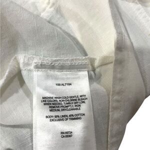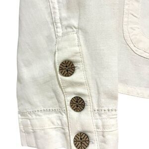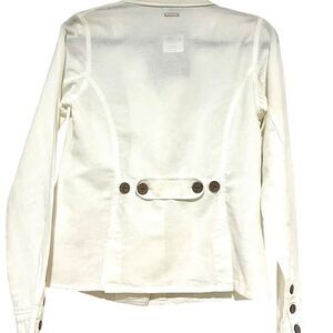White jacket with collar, front buttons, buttons on cuffs and front pockets. Size: S, pit to pit: 17.5”, length: 23”. Cotton, linen blend, back pleat. New!!!