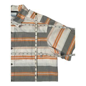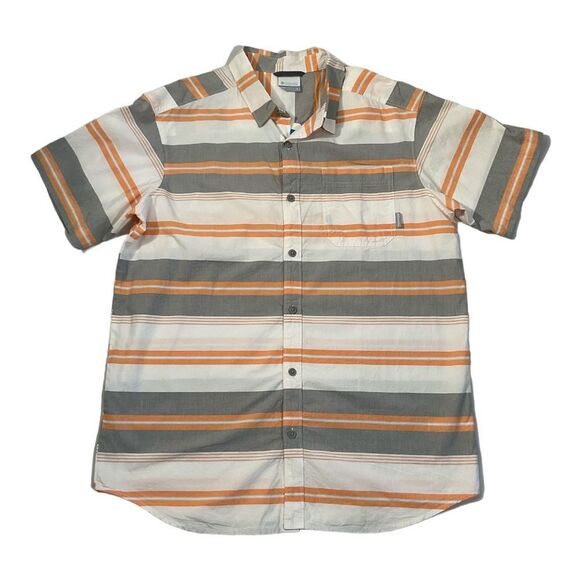 Get ready to reel in your next big catch with the Columbia L Mens Short Sleeve Button Up White Orange Grey Plaid Fishing Shirt.