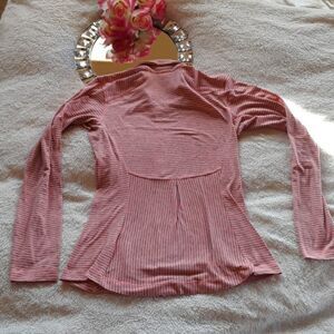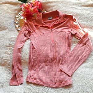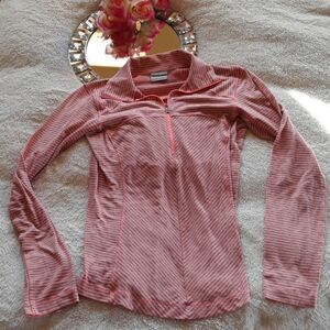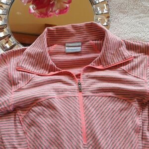 Columbia long sleeve neon orange and grey striped base layer shirt. Features zipper collar, omni-wick advanced evaporation. Warm and comfortable. Size XS