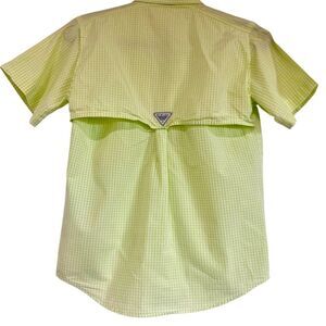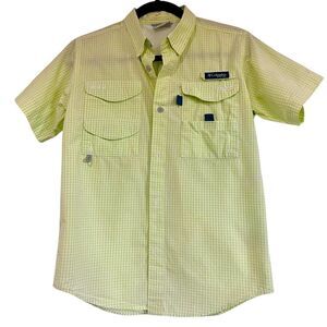 Collar, button up, green and white checked fishing shirt. Netted upper back for comfort. 100% cotton, size: L, pit to pit: 17”, length: 24”, excellent condition