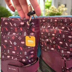columbia powderbug forty print youth snow boots size 6 eu 38 waterproof insulated winter boots kids teens cold weather rated -40 felt liner washable drawcord hook loop strap outdoor snow play sledding skiing snowboarding hiking durable rubber sole new in box