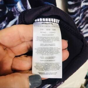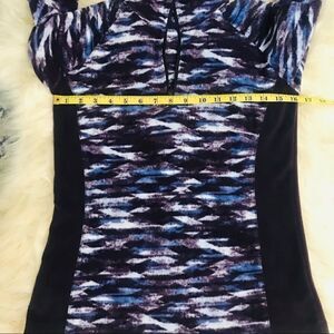 Purple print Columbia Fleece with 3/4 zipper and long sleeved. Solid purple insets on sides. Knit ribbed detailing on sleeves. In “like new” condition with no visible tears, stains, pilling or fading.