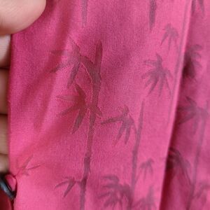 This is a short sleeve pink button up top by Columbia. It has sheer palm trees printed all over. On the front is a button panel using loops for closure. There is an extra button on the inner tag.
