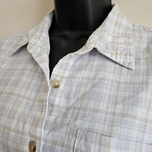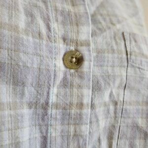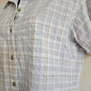 This is a short sleeved button down shirt by Columbia. It has purple, tan, and white plaid print, and a small pocket on the chest. There are extra buttons sewn inside of the button panel.