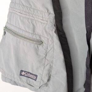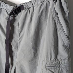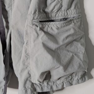 Quick drying polyester cargo shorts featuring several zippered pockets and two additional deep slash pockets, mesh lining and a webbed drawstring adjustable belt. Neutral sage green color, very good used condition.
