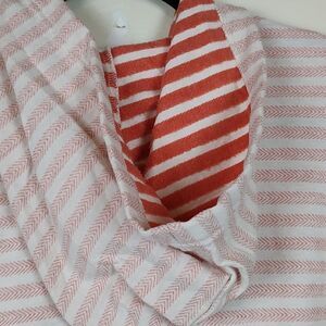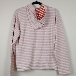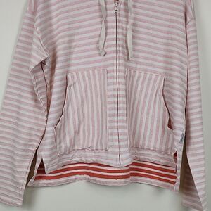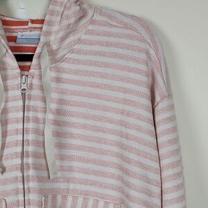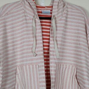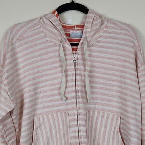 Columbia Striped Full Zip Hoodie Jacket in coral and cream. Super soft fleece lining with a fabric hoodie tie, dropped shoulders and 2 front pockets. This jacket has a straight hem with the back hem slightly longer than the front. Super comfortable and soft 90% cotton and 10% polyester. Size XL.