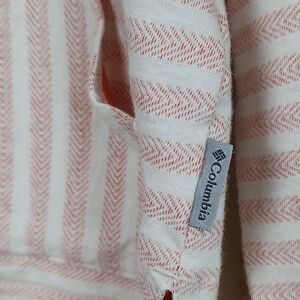 Columbia Striped Full Zip Hoodie Jacket in coral and cream. Super soft fleece lining with a fabric hoodie tie, dropped shoulders and 2 front pockets. This jacket has a straight hem with the back hem slightly longer than the front. Super comfortable and soft 90% cotton and 10% polyester. Size XL.