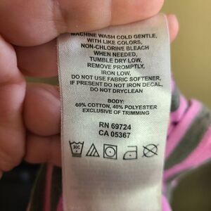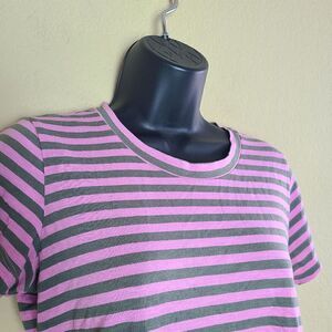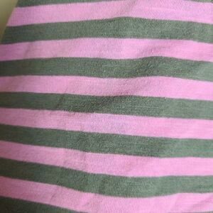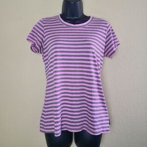 This is a pink and grey striped short sleeved t-shirt by Columbia. It has a little wash wear as shown in the photos.
