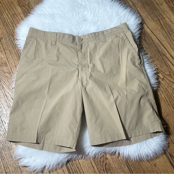Columbia shorts with a tan body and orange waistband. Ideal for outdoor adventures.