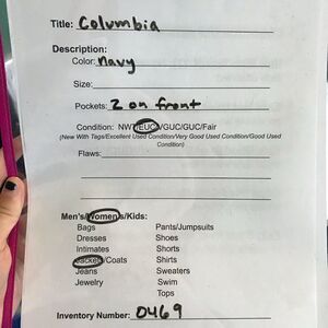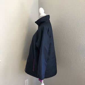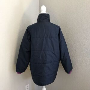 Columbia Woman’s Reversible Jacket. One side is navy blue and the other side is navy blue and purple. The purple side shows several marks but the navy side is EUC. Size Large