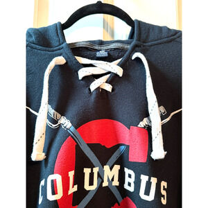Columbus Hockey Sweatshirt Large Blue Crewneck Pullover Lace Up NHL Hoodie Is a heavy weight soft sweatshirt. Ribbed sides, front pocket and lace up front. Slightly oversized. Made by GV Art & Design from Cleveland. This hoodie does not say Blue Jackets. I