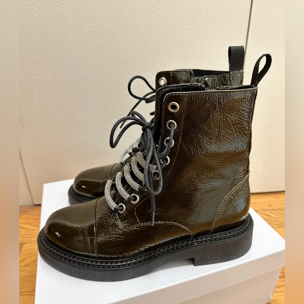 Shiny combat book. Never worn. Still in box. Silver embellish in laces can also be removed. Zipper in size for easy on/off.