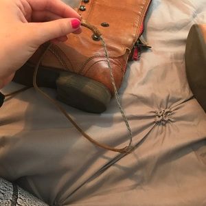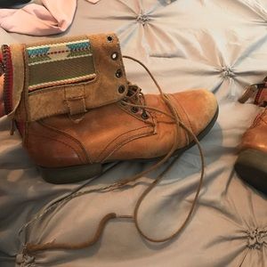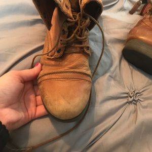 Used brown leather combat boots. Good condition, only problem is one of the laces is worn out.