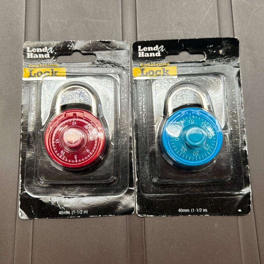 New with package keyless combination locks. Nice Red and Blue colors. How to use directions on back side lock package. Brand new. 40mm(1-1/2 in).
