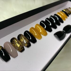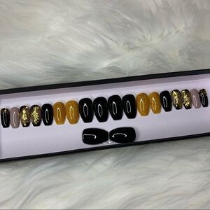 This press-on nail set is designed and hand painted with quality gel polish cured with UV/LED light.